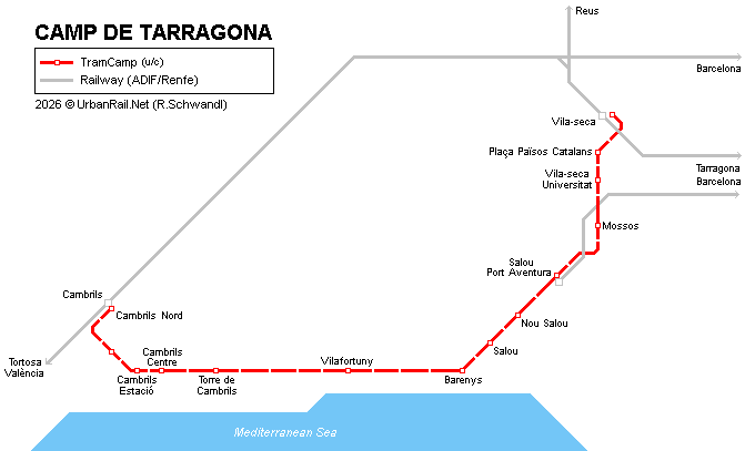 Interurban tramway under construction in the Tarragona/Reus region, with the first phase linking the towns of Vila-seca, Salou and Cambrils on the Costa Daurada; mostly taking advantage of the former railway corridor of the Barcelona-Valencia line which was moved further inland: Tramway |