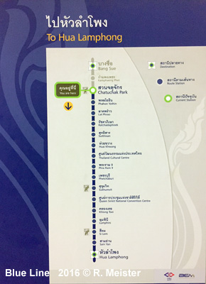 Elevated metro line: 16 stations, 23 km; Construction started early 2010, opened in Aug 2016. (Website) Like the Blue Line, this is an MRT line (MRTA) operated by BEM (formerly BMCL) via a concession contract from the MRTA. 06 Aug 2016: Tao Poon - Khlong Bang Phai