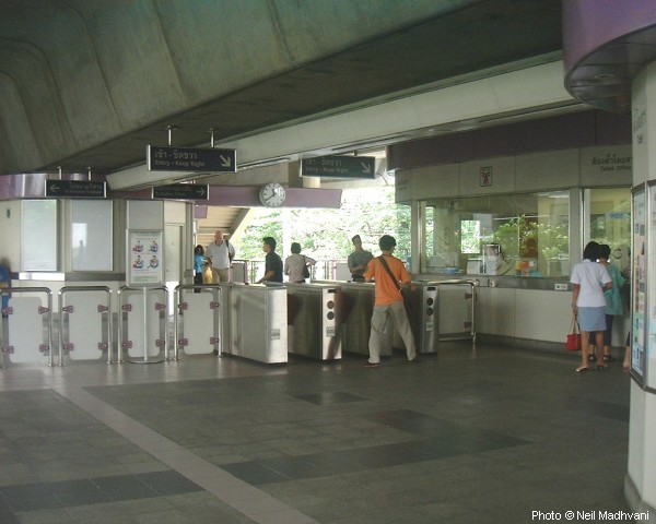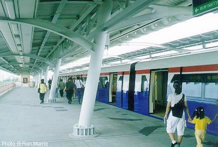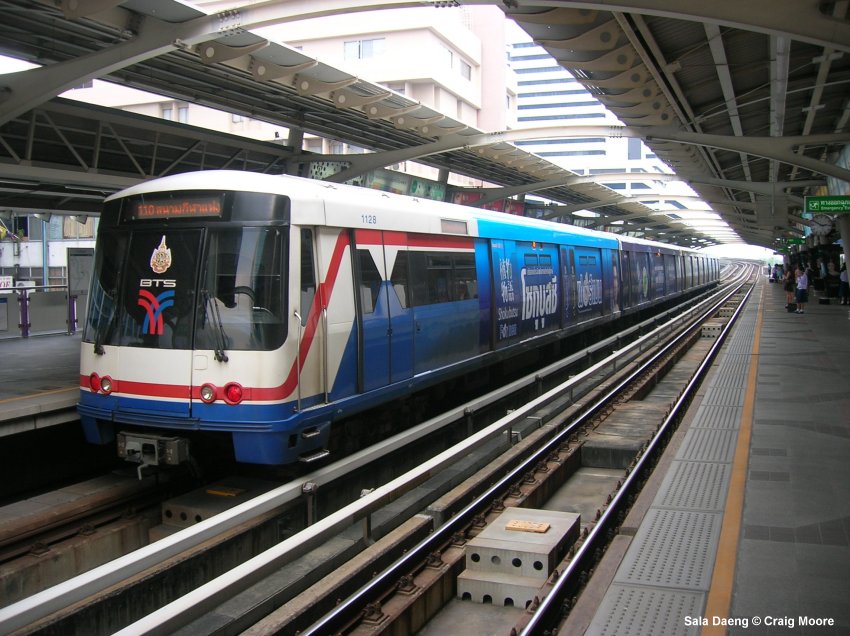 consists of two lines: Track gauge is 1435 mm and power supply is via third rail at 750 V DC. The original 3-car trains were 65 m long (a fourth car was added to all trains between 2012 and 2013), air-conditioned and run at an average speed of 35 kph. Saphan Taksin station on the Silom Line was only planned as a temporary station, but as it offers an excellent connection to the Water Buses on Chao Phraya River, it remains open after the extension to Wongwian Yai, although the single-track section at Saphan Taksin station limits the capacity on the Silom Line. 05 Dec 1999: