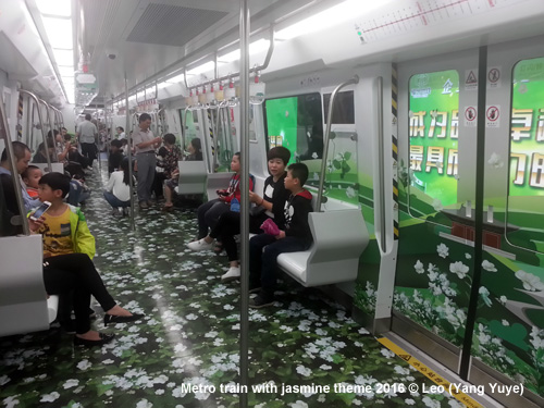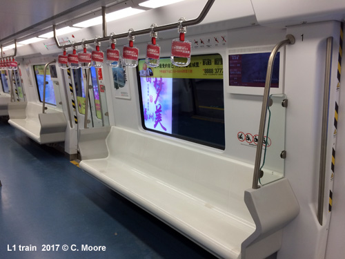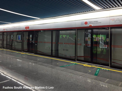In April 2017, Craig Moore sends his views on Fuzhou: Currently, the Fuzhou Metro is a single north-south line connecting Xiangfeng and the city centre (Nanmendou, Chating, Dadao) with Nantai Island and Fuzhou South Railway Station. Besides this, the east-west Metro Line 2 is also in an advanced stage of construction. Opened in 2016, the Metro has a new and clean feel to it. Station entrances are smart and visible with totems topped with the green and white logo. The ticket halls have security screening and banks of automatic ticket machines which dispense red RFID tokens. Here you will find the only schematic map on the system and this is for fare information only. Fares are distance based (2-6 Yuan) and the token is tapped on the stylish entrance barriers located at each end of the station (slotted on exit). The ticket hall has colourful wall paintings depicting local history and culture, a customer service centre where maps and user information is available, and station location information. Stairs and escalators provide access to the platform areas. All 21 stations on the 24.9km fully underground line are similar. Island platforms, full platform screens with station identifier, vertical line map and directional information (all in red). There is limited seating and broad white pillars which show station name (the escalator walls have large calligraphic station names also) and at each end of the platform is a beautiful geographic map of the line, also showing the new Line 2. There are no startling design elements to the line infrastructure, but the stations are functional, clean and spacious. Train services are operated with CNR stock (Type B) in 6-car sets, utilising overhead power supply. The system runs from 0630-2230 with a base headway of 9mins, and a trip along the line takes 45mins. The train exterior is mainly white but doors are in a pale grey and this looks very smart. The interiors are bright and clean and are predominantly white with a blue floor, which is quite unusual in China. There are electronic strip maps above doors, electronic station information and LCD TVs with line and service information. There is no schematic map on the trains (but this may change when additional lines are opened), and advertising seems limited to grab handles, and so opportunity to add colour to the starkness of the interior is limited. Audio information is loud and in Mandarin and English. One thing to note is the seating which has a unique high, angled side. I sat at the end to get a feel of this and it was uncomfortable. Quite why the seats were designed this way I do not know. As for the ride, well as with most new systems here, the acceleration is good and the ride smooth. The ATO, however, means there are very long dwell times at stations. I rode the line late in the evening when passenger numbers were minimal and the train was often stationary for 30 seconds after the last passenger has boarded/alighted. This is a small and simple system and so there is little to comment on. It does not have the distinctive features of some of the newer lines in China, but is effective and functional at what it does. A nice little line. |