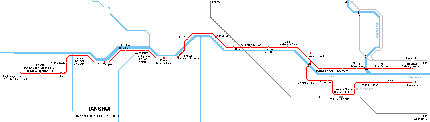 Tianshui is located in Gansu province, some 250 km southeast of the province's capital Lanzhou and 300 km west of Xi'an. It has an urban population of some 3.3 million. TRAM: -
