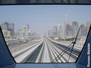 The current population in the city of Dubai is 863,000 with some 2.3 million in the entire Dubai Emirate. Construction on the first stage of Dubai's Metro began in 2005, with the first section of the Red Line opened on 09-09-2009. The Green Line was inaugurated exactly two years later, on 09-09-2011. The Red Line and the Green Line intersect twice, at Union Square and at Khalid Bin Al Waleed (BurJuman Centre). Each of the 87 driverless trains (Thales operating system) comprises five cars, with the first car being divided into first class (Gold Class) and a section reserved for women and children. Metro stations were designed to four different themes: earth, water, air and fire. |