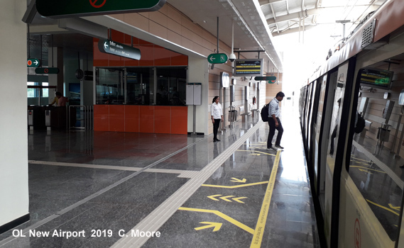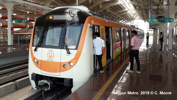 In May 2019, Craig Moore reports from Nagpur: The Nagpur Metro is an 11.8km incomplete line, running from the southern terminus of Khapari to the new industrial zone at Sitabuldi, in the south of the city centre. In the south the line is at grade, running parallel to Indian Railways lines but is elevated after Airport South. The Metro is operated by Maha Metro which is a jointly owned body (Maharashtra state and the National Government) responsible for all metro activity in the state excluding Mumbai (Maha Metro will also run Pune Metro when operational). The line uses standard gauge and overhead supply. At first sight, it is clear that this is a Metro that opened in a rush. The stations are incomplete and there is lots of building work taking place, gaps in the sides of stations, limited access and they currently only have one train. This means that services are limited (3 services in morning and three in evening with 90min gaps between these group services. However, it would be churlish to judge this system based on its current offer as it is also apparent that this will be an impressive Metro. Stations are all of a large scale but vary along the way with some impressive designs and architectural styles the bold orange of the line being a constant. There is on-street signage and a large totem with the lovely orange logo. The station names are large and bold, again the orange making them distinctive. Airport station is possibly the pick of the stations at the moment but all are impressive note that this station is not actually at the airport but at the junction of the airport road (1.2km to terminal). Stations have security, modern ticket gates, ticket office (no machines) and a smart information board with schematic map. Tickets cost 10-20 Rupees and come in paper form with QR code. There is good signage (Hindi, Marathi, English) and the orange-dark teal tones are everywhere it looks very smart. The side platforms are topped by arched roofs and have RTI (currently inoperable). The platform walls and pillars are tiled with pale orange/bold orange tiles and everything is very clean and shiny. There is an army of staff at all stations who meander about and make sure everything is in order and of course, they have that lovely Indian charm. The rolling stock (singular) is of three cars with the first car reserved for females. The trains run pretty empty. The staff informed me that the stock was from CRRC but there is a Rotem plate (2015) on the interior and exterior so I am not sure, but I was told that the future stock is being built domestically at BEML. The train has a colourfully painted exterior with images and bold orange band and is very smart. The interior has metallic seating with orange end plates and grab bars. The ceiling has a nice colourful design and the glass panels at the end of the seats has a tree motif. There is no advertising, no strip map, and no system map, but there are large dynamic LCD screens, which currently just show artists impressions of stations. Audio information in Hindi, Marathi and English and the trains are really lovely and have a bright fresh feel about them they do run very slowly though (43min for the entire 12km journey). So although the Nagpur Metro is just establishing itself, it is apparent that this is a metro with some style - a smart, bold brand, stylish stations and lovely rolling stock. Once the system is fully constructed and operational there will no doubt be wear and tear, but it will be an interesting system to watch out for. At a broader level too, Nagpur confirms that there is a trend in Indian metro development with some of the more recent openings (e.g. Kochi, Lucknow) really taking design and service forward.