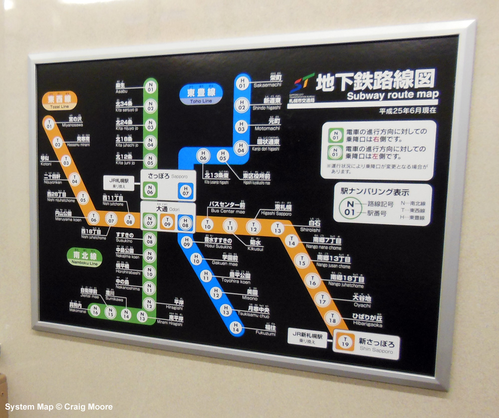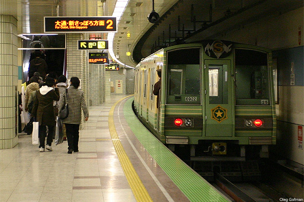Craig Moore reports (2014): Firstly the network. It covers the city and there is no route duplication although there is interconnection between green and blue lines in long underground passageways at Odori and Sapporo Station. These no doubt protect passengers from the harsh winters as does the tubing on the southern sections of the green line. The stations are typically Japanese, festooned with colourful leaflets, signage and very polite staff. Ticket machines are simple to use and there are a range of day passes from Y700 to Y1000 dependent on mode combination. Distance based fares are between Y200 and Y350. Hard copy maps and service information is widely available at most stations and is very good quality. Signage is excellent and interchange easy with coloured tiles directing you easily between lines. Platforms are a little unkempt if I have to be critical, but nothing too dramatic. Half screens on platforms with six-carriage sets (no screens on the blue line and 4-carriage sets). The end carriages are for women and children only during peak hours and this is adhered to. Queuing to enter trains from marked zones on the platforms is also firmly adhered to. The stock itself is large and spacious and very clean with system maps and above door maps. Seats are cushioned and heated and the system is well patronised. The spacious trains are possible because of the wide gauge of the plates. The rubber-tyred system gives good traction as acceleration and braking are rapid. Trains have a good 7 min. headway and are fast, entering stations at 55 kph and soon gain speed on departure with 68-70 kph as top speeds between stations. Journeys are smooth, quiet and rapid and this really is an example of a perfectly formed medium sized metro. The Sapporo Tram consists of three lines although it is in fact one pan shaped loop. It operates from two points on the main shopping street and heads into the inner western suburbs with grid patterned streets. It has a 10 min. headway and is well used but I can't see why. The journey is slow. It takes 42 minutes to do the full loop, this equates to an average of 23 kph.The reason for the slowness - well, the grid patterned streets mean that trams stop before junctions. They have a ticketing system whereby passengers board and pay when exiting. You queue and put your cash in the machine and so alighting takes some time as the gap is small for one person at a time. By the time passengers have left, the lights are red and so there is a long wait. The lack of segregation or of higher speed vehicles and the nature of the route conspire against the trams in Sapporo, I'm afraid. Stock is mixed also - lots of different trams from modern to heritage type. Sapporo also has an S-Bahn type service run by JR Hokkaido. The service is based on a NW to SE core line from Otaru to the Airport with two easterly branches from central Sapporo. Stock varies but headways on the main route are 5-10 mins. with a mix of local and semi-express services. These are not part of the Day Pass, but fares are very inexpensive at Y300. |