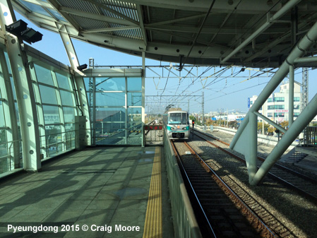 Craig Moore reports from Gwangju in Oct. 2015: Gwangju Subway Gwangju is located in the Honam region of South Korea, in the SW of the peninsular. The city is one of the major provincial centres and has long been renowned as a maverick, left-leaning place. The city is located in a lovely mountainous area although the urban area is sadly nothing special. Gwangju joined the Metro fraternity in 2004 with a single line operated by GMRTC. The line has 20 stations (20.1km), 2 of which (the terminus stations*) are above ground (2.6km). The system uses Hyundai Rotem stock in 4 car sets (through sets), on 1435 gauge, with overhead power. The line operates from 0530-2330 with a base headway of 10mins (services from Pyeongdong and Sotae are at 00/10/20 etc) although peak services are at 7min intervals. The journey from Pyeongdong and Sotae takes 33mins with an additional 4 mins from Sotae to Nokdong*. The fare is a flat fee of 1200 Won (€0.65) and comes in the form of a token that is scanned on entry and placed in a slot on exit. Stations are functional, with a bank of fare machines (which confusingly ask for the fare level when it is a flat fare) and large, simple schematic map. Like many Korean systems, escalators are at a premium. Given that stations are located on main north-south and east-west corridors, there is a reasonable Metro presence in the city, despite there only being a single line. Station entrances offer the usual broad structure with stairs to the ticket hall, but at main junctions there are also Fosteritos (see Bilbao) at diagonal points in the junction. Entrances are accompanied by the usual Korean Totem. The Line uses station numbers (100-121 – east to west). Stairs and occasional escalators provide access from the ticket hall to the platforms – in general I'd say Gwangju was quite a shallow system. The platforms are mixed. The newer western extension has broad, light tiles, whereas the older section has smaller tiles in duller colours such as mustard. Sometimes, each platform wall has different colours (all are capable of taking six car sets – trains stop well short). The platform has a schematic which highlights the current station by a ‘step up’ on the horizontal line (see photo below). Most of the stations have full screens but some have fixed half barriers with gaps where train doors are. I've never really understood the value of such barriers. All but Guemnamno 4 and Culture Complex are side platforms (these two stations have broad island platforms). Platforms have lots of large mirrors (for some reason) but are limited in information and advertising. Station name indicators show last and next station in Korean and English. The only geographic maps available are on large posters in station entrances but these are more maps of the city than Metro Route maps. The mezzanine/ticket hall also has train times but in Japanese style. These are not available on the platforms and there is no 'next train' indicator. The journey itself is pleasant enough. Stock is clean and bright and remarkably free of chintzy advertising. There is an electronic route indicator over 4 of the eight doors in each carriage – the other doors also have a line map but with nearby landmarks listed and green circles around the island platform stations. There is electronic information in Korean, Mandarin and English, and audio information in Korean and English. Stations of significance (eg KTX or Airport) have sound affects such as birds tweeting or Brahms Deutsch Symphony - quite the reason I don’t know). Starting from the west, Pyeongdong is elevated and crosses the KTX line before traversing the Hwangnyong River and then takes a slow decline to the portal before Dosan Station. Songjeong has much passenger traffic as it is the KTX terminus. Airport station could possibly be renamed ‘roughly in the vicinity of ...airport’ as its a bit of a treck through car parks and along a road bordered by rice paddies – able bodied with hand luggage is fine but anything else – it's a long treck. From Airport the route heads into Seo-gu district on an east-west trajectory along the main thoroughfare from the convention centre to Nongseong. Here the stations are bunched more closely and have the Forsteritos mentioned above. Further east the line takes a gentle turn South East (you don’t really feel this on the train) along the traditional city centre. Here we find the two island platform stations. Trains then terminate at Sotae*.