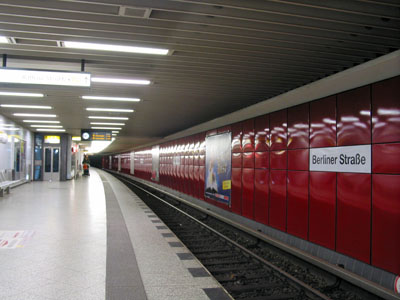 Large-profile line with ~100 m long platforms (6-car trains of F and H stock). Line U9 operates every 5 minutes during off-peak daytime service, and every 4 minutes during peak hours. Line U9 was opened shortly before the Berlin Wall was erected in 1961. It runs entirely on former West Berlin territory and is an important north-south axis bypassing the historic city centre. It is completely underground, and thanks to its straight alignment one of Berlin's fastest lines.