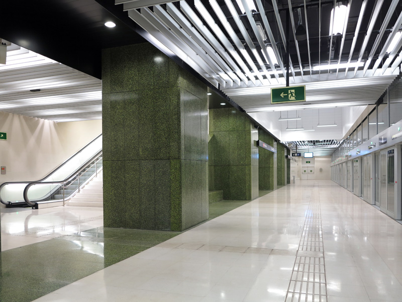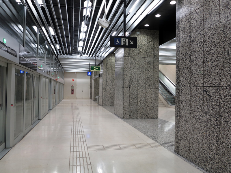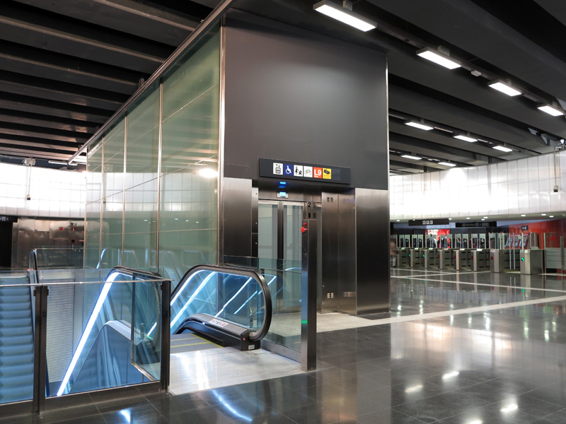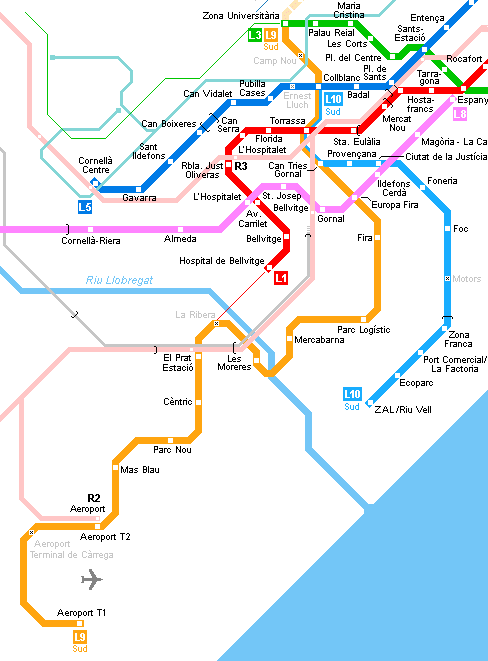 Eventually Line 9/10 will run like a semicircular line from the Airport and Passeig de la Zona Franca to Zona Universitària, further on to Sarrià and Lesseps and via Guinardó and Sagrera-Meridiana to the planned Sagrera AVE Railway Station. Then north to Bon Pastor and under the Besòs river splitting into two branches, one to Santa Coloma (Can Zam) and one to Badalona (Gorg - L2). Construction from Sagrera-Meridiana (L1, L5) north to Can Zam and Gorg began in late 2001. L9/10 is being excavated by tunnel boring machines at great depth, with a 12 m diameter tunnel, which allows trains to run on top of each other. Most stations will be located inside this tunnel and be accessible by lifts. The line is operated in driverless mode and the stations are therefore equipped with platform screen doors. Part of the Zona Franca leg in the south will be elevated. The project has repeatedly been modified, especially in the airport area. The first section of this 46.6 km long line was due to open in 2005 from Fondo to Can Zam, but was only brought into service in Dec. 2009, with the second of the two northern branches following in 2010. The isolated L9 Sud began operation in Feb. 2016, followed by the first section of L10 Sud in Sept 2018.