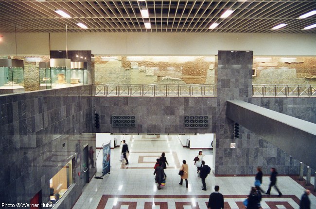 KEY FEATURES: The basic project consists of two lines running from northeast to southwest [line 3] and from northwest to southeast of the central area [line 2] corresponding at "Syntagma" transfer station. An older existing line [line 1 or "ISAP"), historic, as it is operating since 1869, is linked to the new network at "Omonia" - most central square of Athens -and two more stations. Additionally, the new network includes 18.2 km of line length, 21 new stations and is built totally underground. Two TBMs (tunnel boring machines) were used to open the tunnels, and stations were built using both NATM and Cut-and-Cover methods. A basic question asked about Athens metro is how the construction of such a large project would not affect the city's vivid historic nature, as it is taking place in the most interesting locations of classical times. In fact, building the metro, offered a unique chance to bring to light a multitude of archaeological treasures and promote the research over the form and features of the city throughout the centuries. The most extended excavations ever known in Athens took place in stations like Syntagma, Academia and Olympieion revealing bathhouses, metal working shops, aqueducts and cisterns, ancient roads and city walls and even an enigmatic room with oil lamps decorated with erotic scenes. Many of the smaller exhibits are presented in the stations themselves, while "Syntagma" can boast a ground's section preserved to its original stratigraphy and can be seen through a curtain wall. The rest of the project lies to the safety of great depths as it is built 20-30m below surface, which is far from public infrastructure networks and antiquites level, thus avoiding costly and time consuming disruptions. The geological and geotechnical conditions along the 18 km alignment of Athens Metro lines have been extensively investigated, analysed and evaluated. A vast number of boreholes were performed prior and during the construction period drawing valuable conclusions over the geophysical and geotectonical features of the subsoil and the presence of water. Everybody learned about "Athens Schist", scientifically described as a sequence of originally sedimentary, flysch-like rocks of possible Upper Cretaceous age, that have been subsequently subjected to metamorphosis". Despite the knowledge acquired through studies, real-time conditions proved significantly diverse. Unstable soil caused numerous problems across several parts of the city center as a demolition of a building and continous subsidences in "Panepistimiou" avenue. Metro was making news all throughout October 1997, when viewers experienced, during a regular live transmision, the unexpected disappearing of a news-stand into the ground. Hundreds of tons of concrete were needed to stabilize the soil causing an unprecedented mess on already congested traffic and leading to a series of disputes about responsibility.