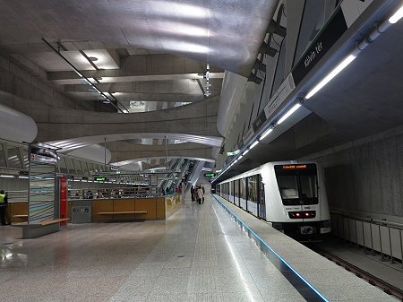Line M4 (7.4 km) runs totally underground between Keleti and Kelenföld railway stations crossing M3 at Kálvin ter, then under the Danube river to Szt. Gellért ter and south-west through Buda. After long delays, the first section (Kelenföld va. Keleti pályaudvar) eventually was brought into service in spring 2014. Line M4 features driverless operation. The track area is surveilled by a infrared system, as no platform screen doors have been installed. 28 March 2014: Kelenföld vasútállomás Keleti pályaudvar More about line M4 |