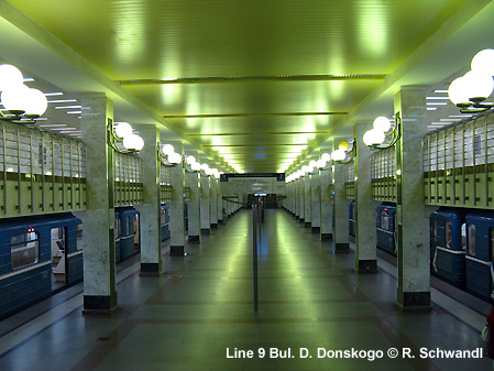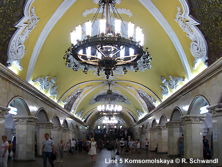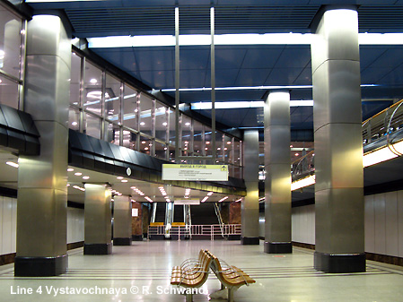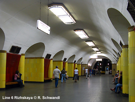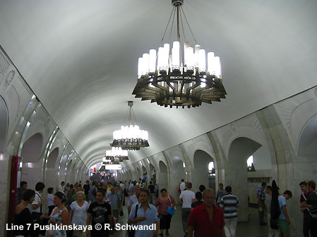 The reason for the construction of a deep part of the Arbatskaya was the beginning of the Cold War. Stations are very deep and were planned to serve for hiding people even in the case of nuclear war. After finishing the line in 1953, the upper tracks between Pl.Revolyutsii and Kievskaya were closed. In fact they were reopened in 1958 as a part of the Filyovskaya. In the further development of the metro, the term stages was not used anymore, although sometimes the stations opened in 1957-1958 are referred to as the fifth stage. [View a station by station depth map created by Alexey Goncharov] The Moscow Metro has standard Russian gauge, 1520 mm, and third rail supply. The average distance between stations is 1790 m (!), the shortest with 500 m is between Vystavochnaya and Mezhdunarodnaya (Line 4), and the longest with 6.6 km between Krylatskoye and Strogino (Line 3). At 73 m below the surface, Park Pobedy is among the deepest stations in the world. With the exception of lines 4 and 12, all station platforms have been consistently built 162 m long. Whereas most transfer stations have two separate stations carrying two different names and connected by foot tunnels, six offer convenient cross-platform transfer: between lines 6 and 7 at Kitay-Gorod, between lines 2 and 11 at Kashirskaya, between lines 6 and 8 at Tret'yakovskaya, between lines 3 and 4 at Kuntsevskaya, between lines 3 and 8A at Park Pobedy and between lines 9 and 10 at Petrovsko-Razumovskaya. The metro network is complemented by an expanding S-Bahn-style rail network which comprises a circular line (MCC, line 14, metro-style frequency) and two cross-city lines (MCD). |